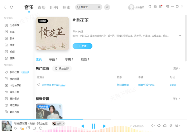 这同样是一款超级好用的音乐平台,歌曲资源超级丰富,惜花芷主题曲也可以轻松找到并进行收听,更重要的是收听该歌曲完整版目前是不花钱的。