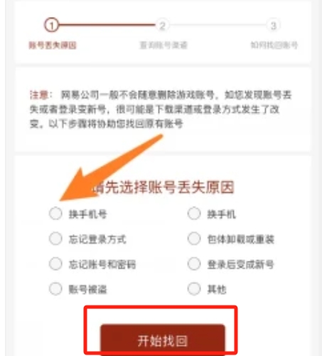2、选择账号丢失的原因,然后点击【开始找回】。
