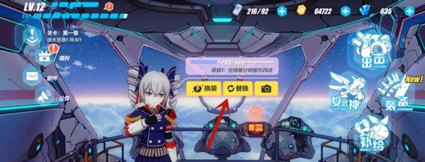 第一步,在手机上运行崩坏3游戏,在主界面找到右侧的“女武神”选项,如图红色箭头所指的位置。