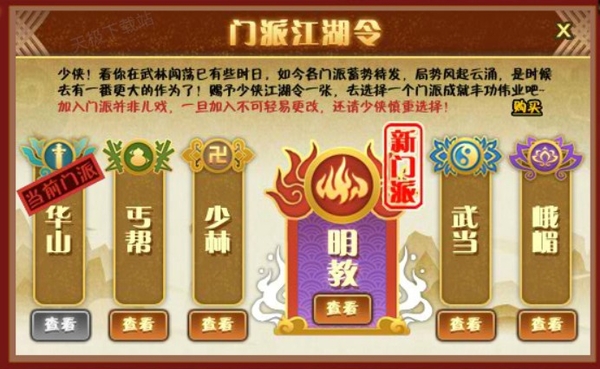 在游戏中,只要玩家等级达到了20级就可以选择一个江湖门派加入,每个门派都有自己的独门武器技能以及心法可供学习。