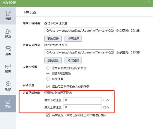 3、调整限速。也可能是某次机会,我们将QQ游戏大厅下载游戏的速度,设置了限速,比如5KB/S,那之后它将都会以此速度下载游戏,其结果就是非常慢。