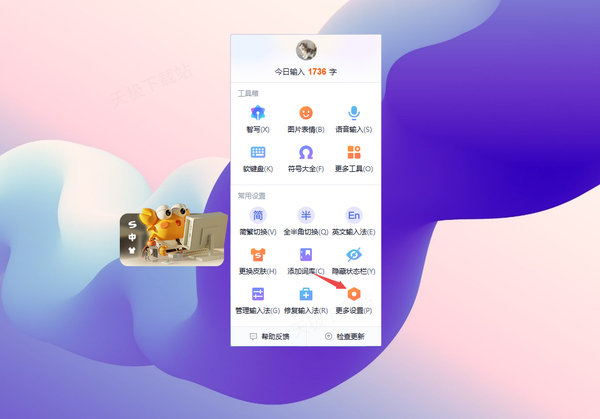 1、将电脑的输入法切换至搜狗输入法,然后在输入法的状态栏上按下鼠标右键,选择【更多设置】选项。