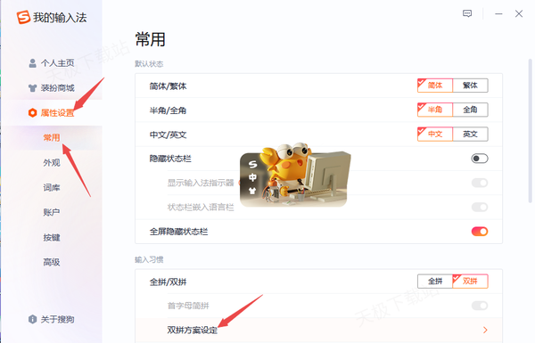 2、接着,找到【属性设置】选项下的【常用】设置选项,然后在右侧的界面中,找到【输入习惯】选项下的【双拼方案设定】选项,点击它。