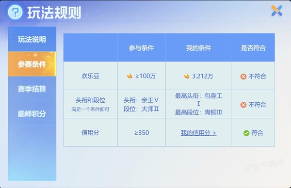 3.信用分达标:此外,为了维护公平竞技环境,参赛者还需拥有良好的游戏信用记录,信用分需≥350分。