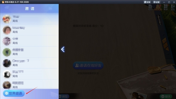 4.如果我们发现好友没在线,我们还可以进行大厅召集,点击左下角的“世界邀请”邀请全国游戏玩家一起玩。