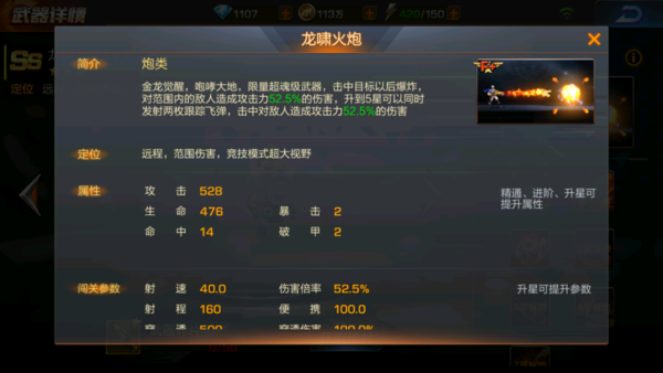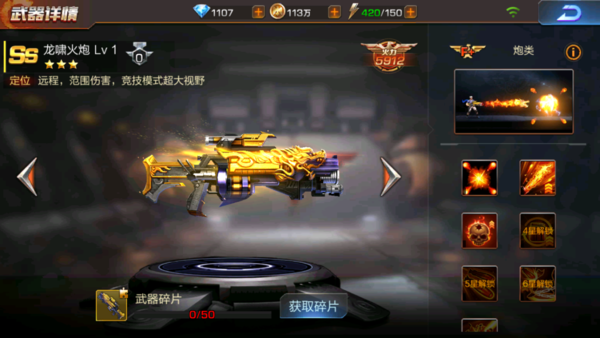 1,对武器提升破甲值就可以提升整体的伤害了,我们先选择一把好用的武器比如龙啸火炮,这个武器的范围伤害很广,在竞技场里面有更好的视野范围。