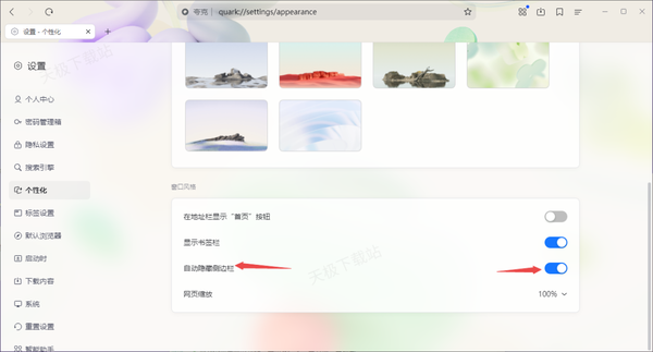 2、将右侧的界面向下滑动,找到【自动隐藏侧边栏】功能,将此功能开启即可。