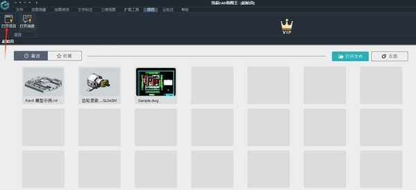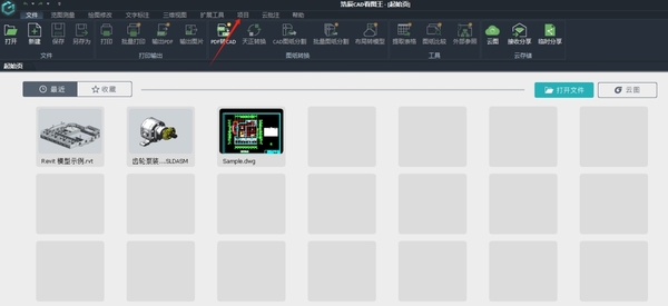 1、来到浩辰CAD看图王主界面,我们可以找到上方工具栏,其中有一排文字,我们点击其中的【项目】。