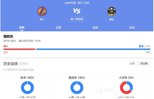 在目前的球迷支持率对比中,掘金队以78%的支持率领先,而湖人队则以22%的支持率紧随其后。这显示出掘金队在本赛季的表现得到了更多球迷的认可与喜爱。然而,比赛的结果往往并非由支持率决定,湖人队同样拥有强大的实力和深厚的底蕴,他们将在赛场上全力以赴,争取取得好成绩。