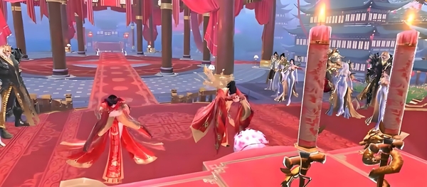 四,来到拜堂环节,一对新人和喜娘对话,并成功开启拜堂,建议宾客们有顺序的站在光圈里,保证现场的秩序,这样还能够获得一些个人贡献度。