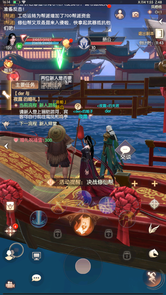 三,婚礼总共有三个流程,分别是游船,拜堂和宴席。两个新人先要在游船上与NPC艄公对话,其他宾客可以沿着桥梁来到正厅等待,这对新人在游船上可以和NPC艄公对话扔礼物,每一份礼物都有好东西装在里面。