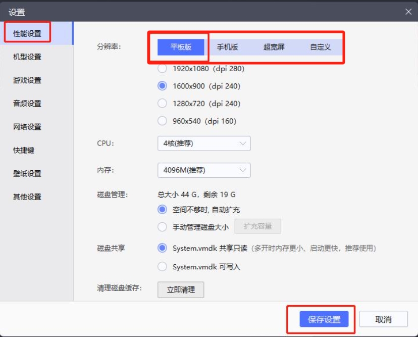 2、在设置界面中,找到并点击“性能设置”选项,再点击“分辨率”,你会看到有“平板版”、“手机版”、“超宽屏”、“自定义”等选项。