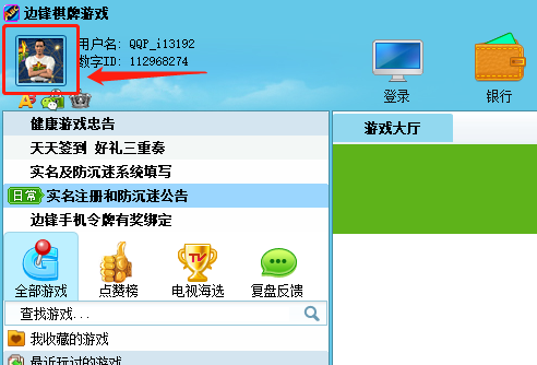 在边锋游戏大厅主界面左上方点击个人的头像。