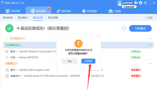 8,进度条到头之后,代表已经完成还原驱动这个操作了,然后会提示用户需要重启电脑才能够生效,我们点击蓝色的“立即重启”选项就可以了。