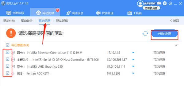 6,完成备份以后,就可以把想要进行驱动还原的选项进行勾选,然后点击界面右上方的蓝色“开始还原”功能进行操作了。