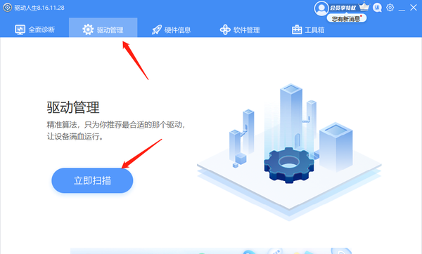 1,第一步,在电脑上启动驱动人生的软件客户端,在首页找到“驱动管理”这个功能,点击之后就会出现“立即扫描”的按钮,我们就可以对驱动程序进行扫描了。
