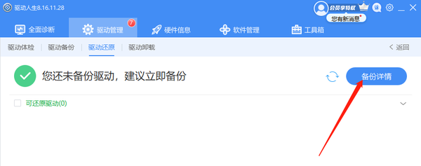 3,注意看,这个时候软件就会弹出一个关于“还未备份驱动,建议立即备份”的提示,因此我们可以连接蓝色的“备份详情”按钮进行查看。