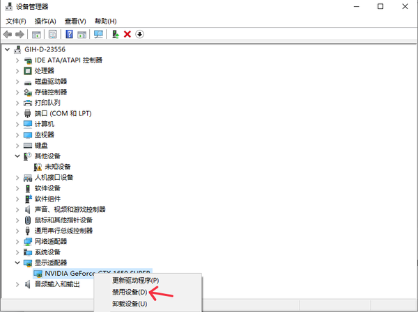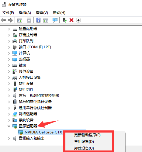 5,将光标放置在这里,点击右键,然后选择显示适配器下的集成显卡/独立显卡,如下图所示的NVIDIA显卡,接着点击禁用。