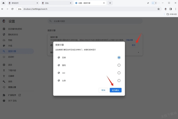 4.最后,我们点击旁边的“更改”按钮就可以自定义豆包的搜索引擎了,这里有百度、搜狗、360、头条,四个搜索引擎供我们选择,选择好后点击“设为默认”就可以了。