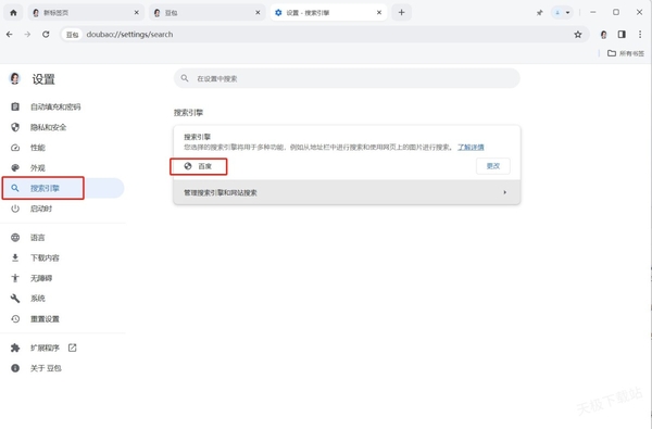 3.接着,我们在网页浏览设置页面的左侧功能栏里找到“搜索引擎”功能,这里我们可以看到当前的搜索引擎是百度。