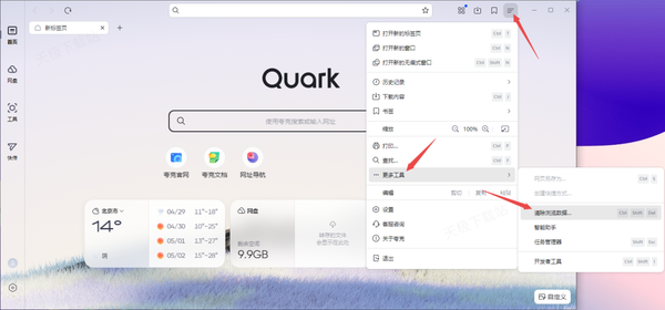 点击浏览器顶部右上角的【三】图标,在【更多工具】中,选择【清除浏览数据】功能。
