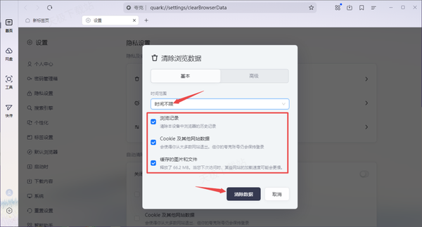 最后,将【时间范围】选择为【时间不限】,勾选需要清理的数据,最后点击【清除数据】按钮即可。