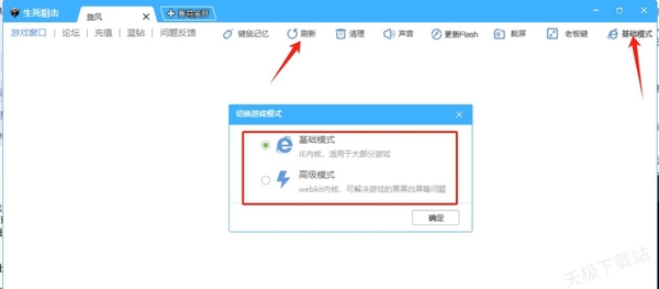2.如果清理缓存后问题仍未解决,可以尝试切换浏览器的浏览模式。在游戏框体右上角找到“基础模式”选项,将其切换为“高级模式”,然后刷新页面进入游戏。这种切换模式的方式有时可以解决一些兼容性问题,使页面恢复正常。