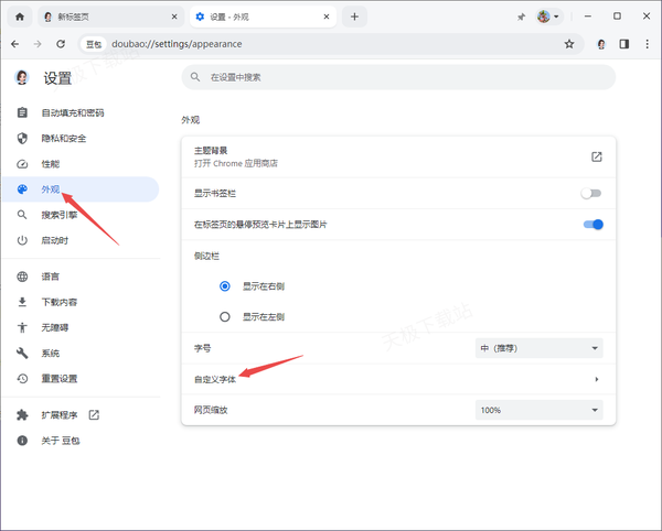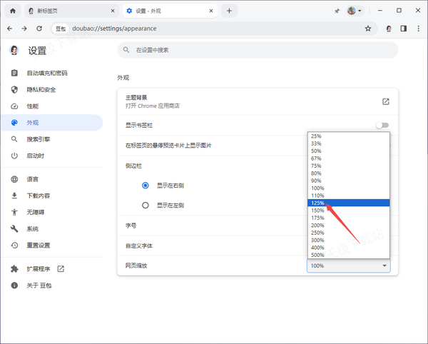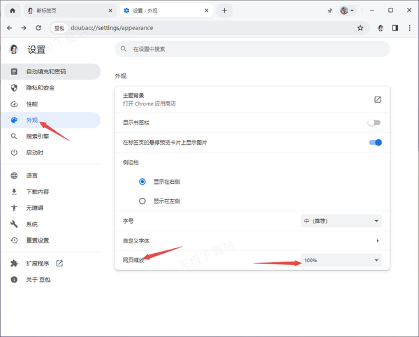 1、还是按照上述的方法,进入到豆包的【外观】设置界面中,然后在右侧的界面中找到【网页缩放】选项,点击它。