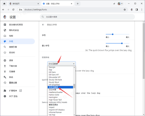 2、字体安装好以后,再次进入到豆包的外观设置界面中,选择【自定义字体】选项。最后在【标准字体】选项中找到刚刚安装的字体并选择它,就可以了。