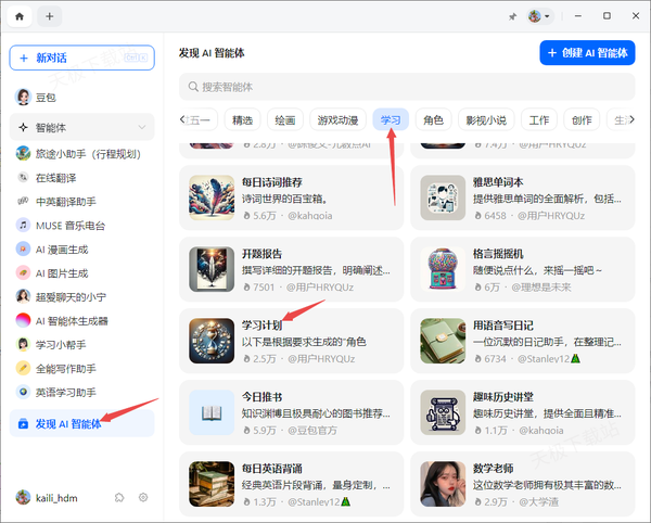 1、还是在豆包的【发现AI智能体】的【学习】板块中,找到【学习计划】功能,点击它。