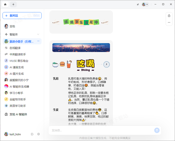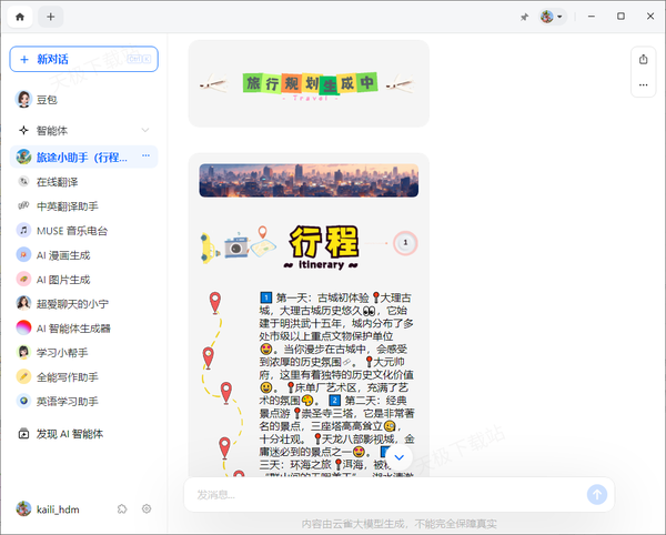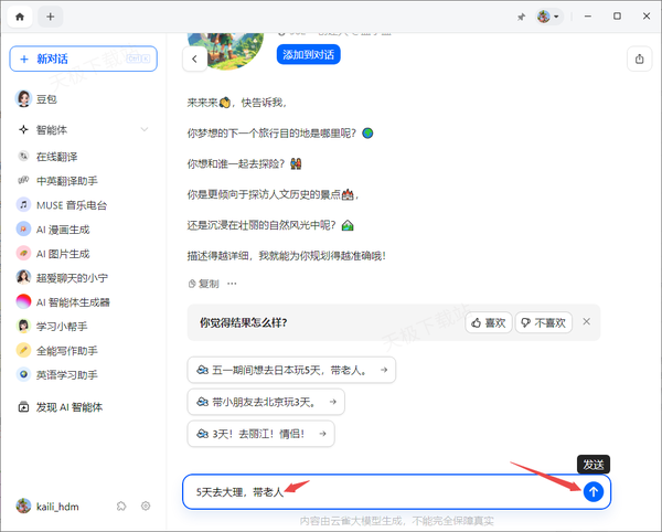 2、接着,在旅途小助手功能界面中,输入自己想要去的地方以及各种行程要求,比如【5天去大理,带老人】,然后点击【发送】按钮或按下回车键。