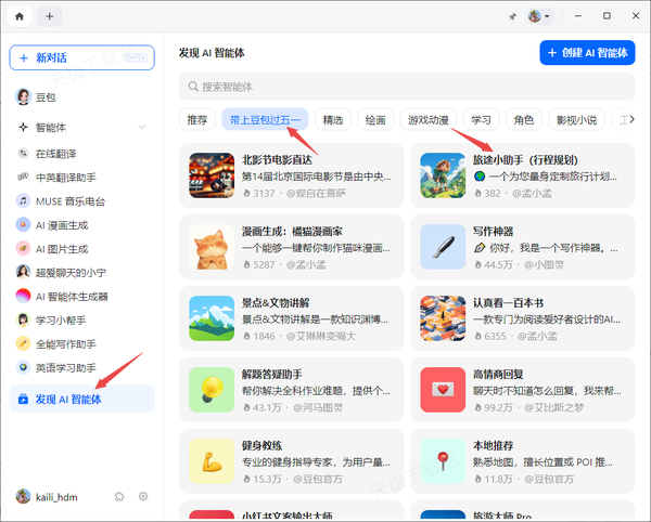 1、启动软件,点击左侧列表底部的【发现AI智能体】选项,然后在右侧的界面中,找到【带上豆包过五一】的板块,并在此板块下方找到【旅途小助手】功能,点击它。
