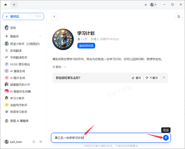 2、接着,输入要制定学习计划的具体科目等内容,比如【高三五一化学学习计划】,然后按【发送】按钮或按下回车键。