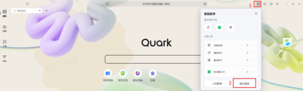 a.打开夸克浏览器,点击右上角四个方块,点击插件精选。