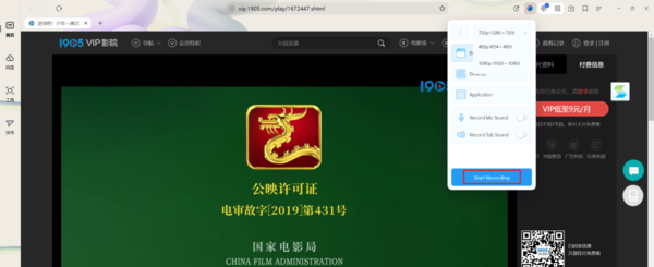 3.在上方选择录制视频的“分辨率”,然后上面三个选项不用动,往下两个选项的意思是“录制麦克风声音”和“录制选项卡声音”,按需选择即可,然后我们点击下方“Start Recording”开始录制。