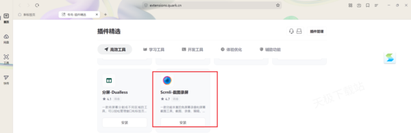 夸克浏览器是我们常用的浏览器之一,它拥有网页加载速度快、界面简洁、无广告等优点,非常好用。小伙伴们在使用夸克浏览器时可能会想下载网页视频,但一些网站并不支持下载,而夸克浏览器本身也没有下载网页视频的功能。别担心,虽然不能下载视频,但夸克浏览器可以直接录制页面视频,只需安装一个“Scrnli-截图录屏”插件即可,下面小编为大家介绍具体方法。