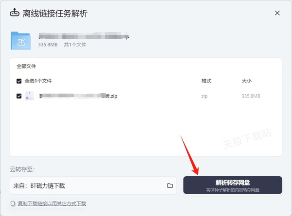 4.转存到网盘:在解析页面中,选中解析完成的磁力任务,并选择转存到网盘即可开始下载。