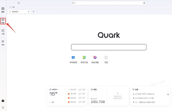 1.打开夸克浏览器:打开你的夸克浏览器,并在左侧功能栏中找到并点击“网盘”功能。