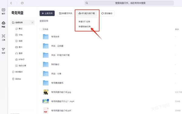 2.新建链接任务:在夸克网盘页面,找到上方的“BT/磁力链下载”功能,并点击它选择“新建链接任务”选项。
