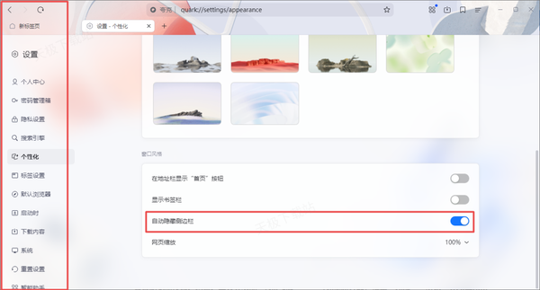 3、最后,在【窗口风格】选项下,找到【自动隐藏侧壁栏】功能并将此功能打开,就会发现,左侧的侧边栏已经不见了。