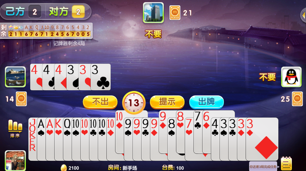2.升级:每一轮开始级数为2,每一回合只有上游(获胜方)可以升级,根据队友的排名,确定获得的级数。队友二游,升三级;队友三游,升二级;队友下游,升一级。败方不升级也不降级。