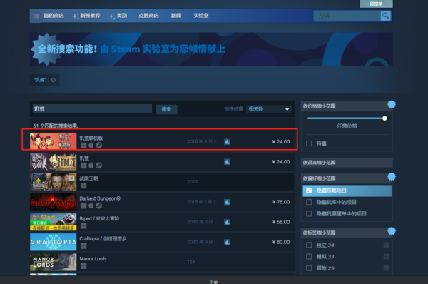Steam作为一个热门游戏平台,饥荒自然是可以在这里找得到的,在商店中找到这款游戏后,点击进入到游戏详情页然后购买就可以下载安装了。Steam保留了饥荒游戏中的很多趣味性内容,MOD的数量很丰富,且持续更新的速度也比较快,但是汉化没有WeGame完成的好。
