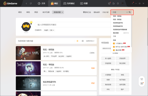 在WeGame中是可以找到饥荒的几个版本的,打开客户端在右上方搜索饥荒,按下回车键或搜索键,这时候下面就会出现饥荒的各种版本,在这里选择自己所需要的版本进行购买,之后下载安装就可以开始玩了。这里值得一提的是,WeGame对于游戏的汉化工作完成的比较细节,所以如果是更喜欢玩汉化版的小伙伴可以在WeGame中购买安装哦。