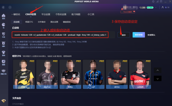 来到设置界面后,我们点击上方模块栏中的【CSGO设置】,切换模块,之后就能看到启动项栏,我们在此可以输入各种启动项,点击保存后,即可成功设置。