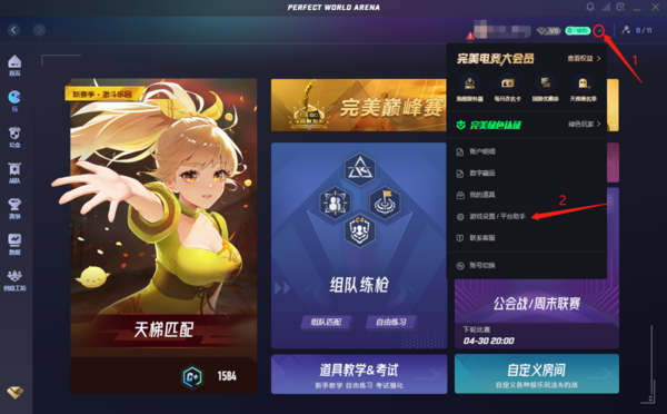 当我们成功登录完美竞技平台之后,在任何界面时,点击右上方角色账号状态栏右侧的【小箭头】,此时会下拉出会员开通和其他设置,我们点击其中的【游戏设置】,进入设置界面。