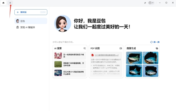 1、我们打开豆包客户端,一开始显示的是它AI的界面,这时我们只需点击上方【加号】,就可以打开新的空白页。