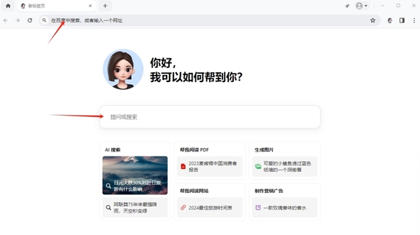 2、在新的空白页中,我们既可以选择在上方网址栏直接输入网址进行页面访问,也可以在中间的搜索栏中搜索内容,通过搜索引擎查找网页。