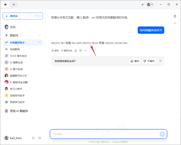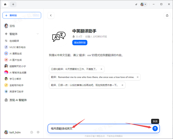 2.最后在输入框中输入要翻译的中文内容以及要翻译的语言种类,比如【电风扇翻译成英文】,然后按下【发送】按钮或者是回车键。
