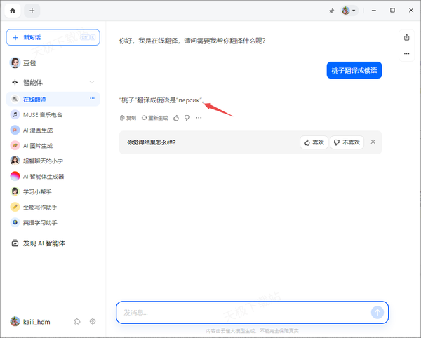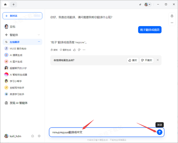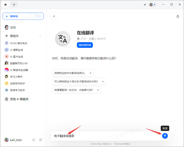 3.紧接着,在底部的输入框中输入要翻译的内容以及要翻译的语言种类,比如【桃子翻译成俄语】,然后点击【发送】按钮或按下回车键。