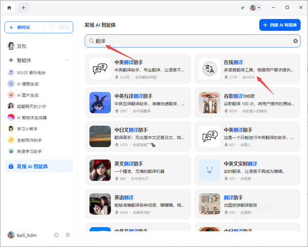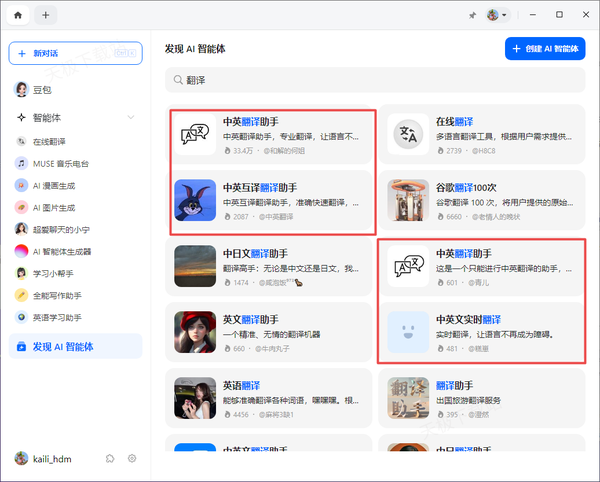 1.在豆包软件的【发现AI智能体】界面中,搜索【翻译】功能,然后找到支持中英翻译的工具,比如【中英翻译助手】、【中英互译翻译助手】、【中英文实时翻译】等功能,点击它们。